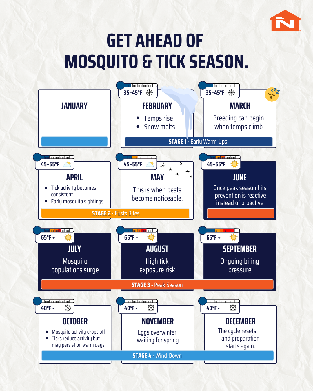 Mosquito eggs laid in the fall survive the winter. As temperatures rise in early spring, they begin hatching, often weeks before adult mosquitoes are noticeable. Ticks follow similar patterns, becoming active as conditions warm.